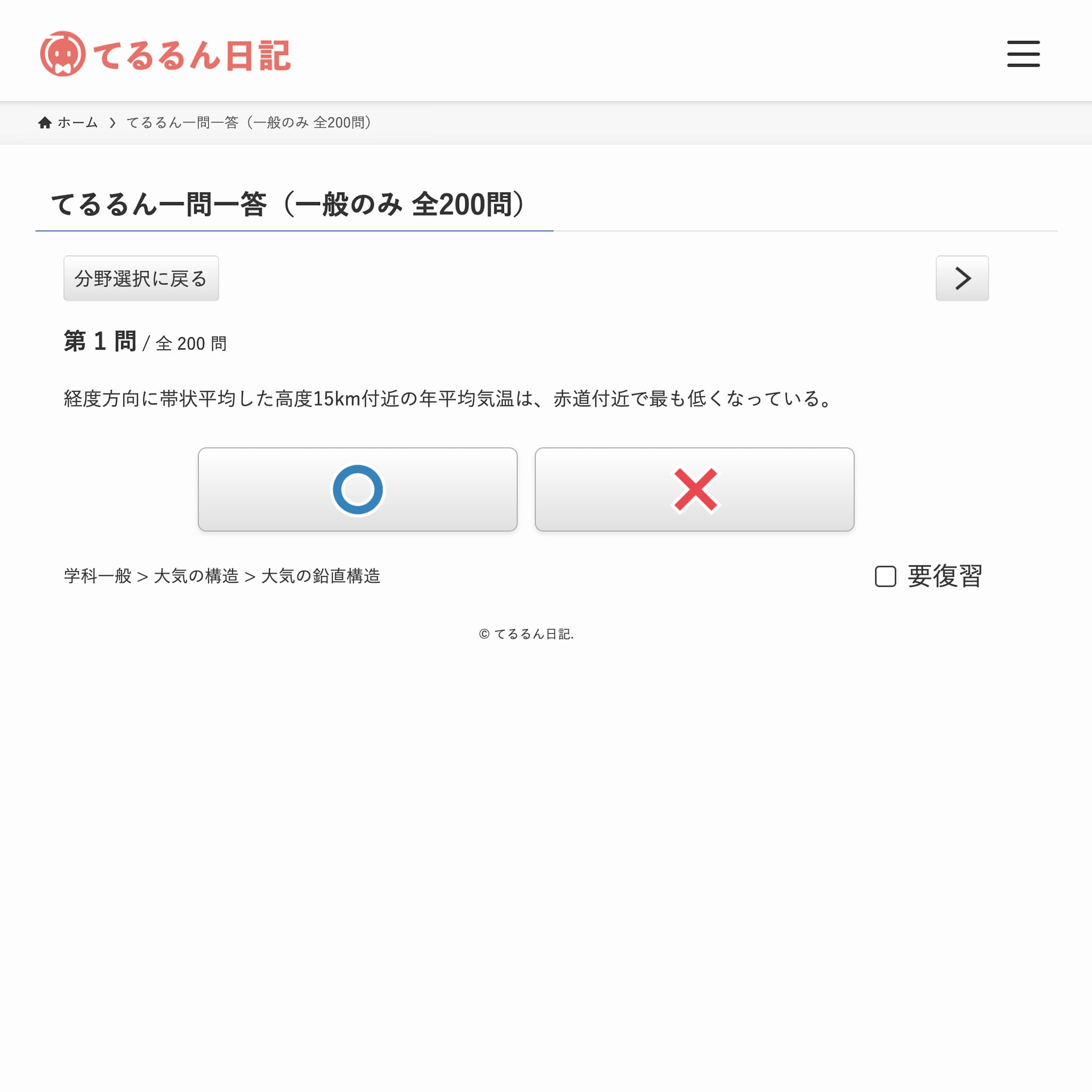 気象予報士試験対策の一問一答アプリ「てるるん一問一答」の「一般のみ 全200問プラン」です。